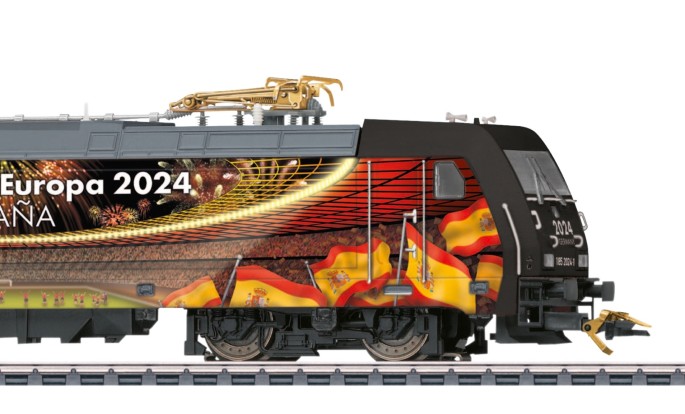 Die Fußball-Europameisterschaft ist nun zu Ende und Spanien hat sich im Wettbewerb als bester Teilnehmer durchgesetzt. Märklin gratuliert dem frisch gebackenen Europameister mit einem speziellen Sondermodell in streng limitierter Auflage.Die fiktiv gestaltete Elektrolok der Baureihe 185.2 "gratuliert" dabei sowohl auf Deutsch als auch in Spanischer Sprache (2 unterschiedliche Lokseiten). Das digitale Modell ist mit vielen Licht- und Soundfunktionen ausgestattet. Die Pantografen und die Kupplungsbügel sind echt-vergoldet (24-Karat).